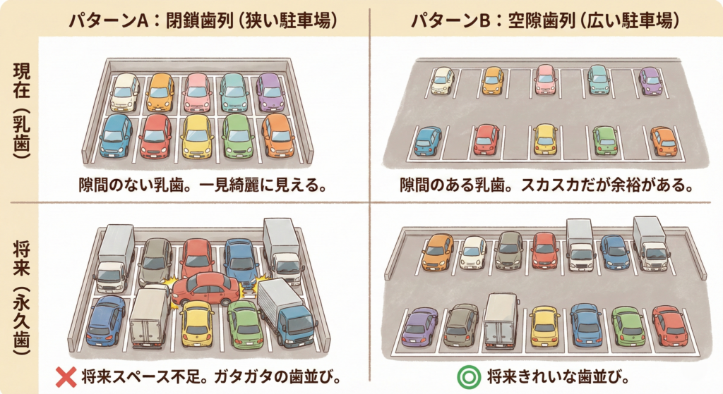 今回は、なぜ乳歯の時期に隙間が必要なのか、クリニックで実際にお話しする例え話を使って解説します。