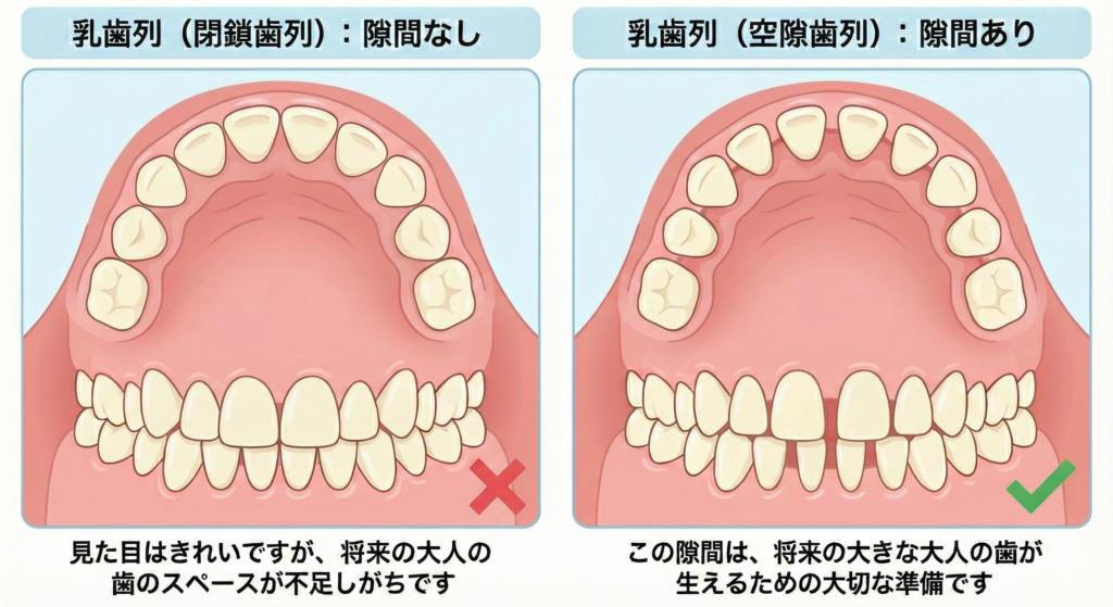 乳歯の段階で隙間があるということは、「将来、大人の歯がきれいに並ぶための準備が順調に進んでいる」という安心材料の一つと言えるのです。
