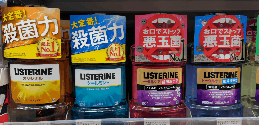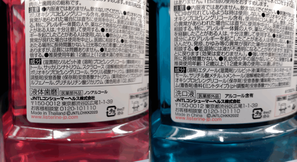 上の画像の4つは同じように見えますが「液体歯磨」と「洗口液」が混ざって陳列されています。