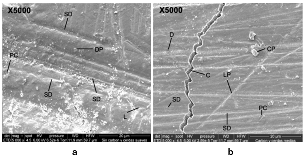 (b) 活性炭が配合の歯磨き粉と一般的な歯ブラシを用いてブラッシングをした後のエナメル質