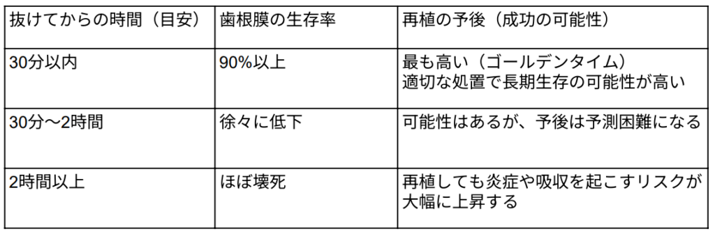 抜けた永久歯を元の位置に戻す「再植」治療の成功率は、受傷から歯科医院で処置を開始するまでの時間によって大きく変動することが、多くの研究で示されています。