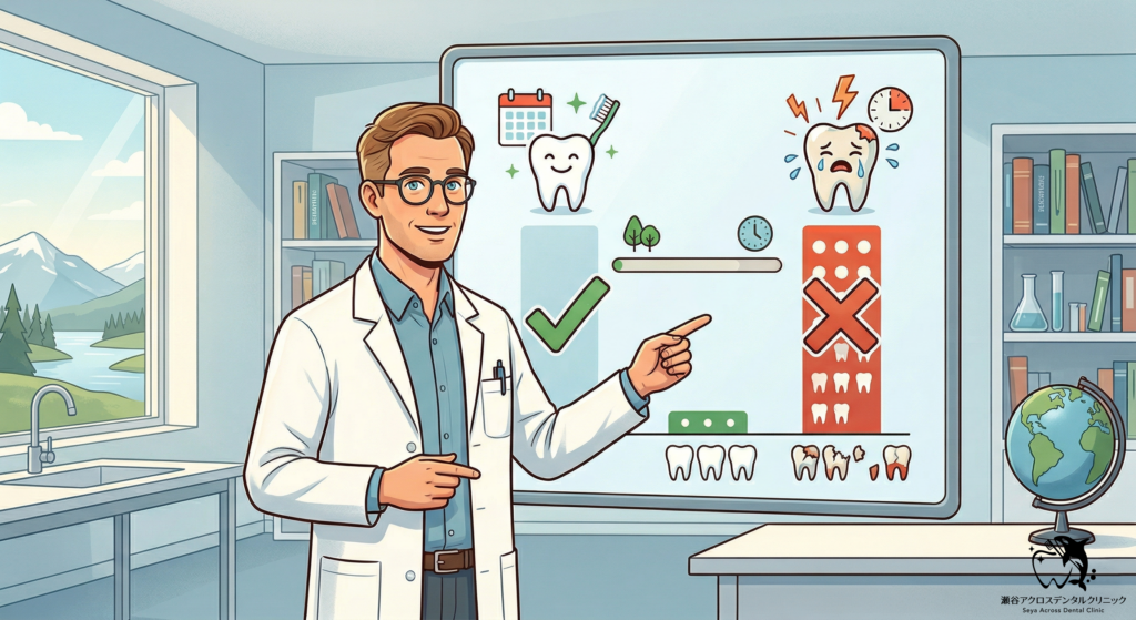 このデータは、日々のセルフケアに加えて、歯科医院での定期的なプロフェッショナルケアがいかに「ご自身の歯を一生残す」ために重要であるかを明確に示しています。