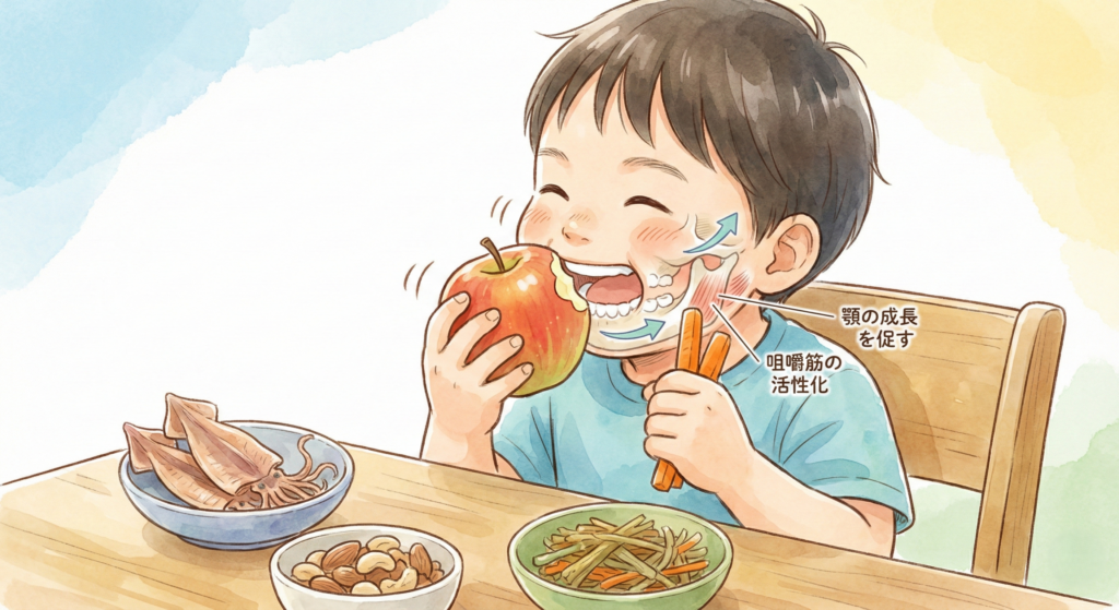顎の成長のためには、単に噛む回数だけでなく、「噛み方」の質を向上させることが重要です。