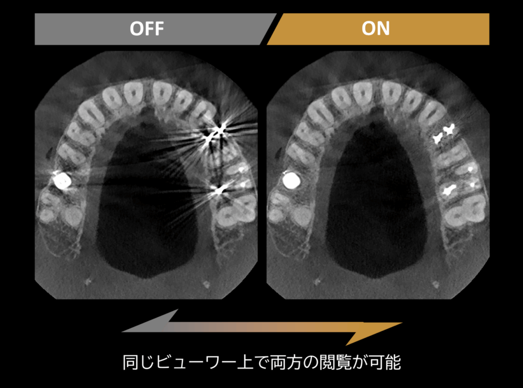 従来のCT撮影では、お口の中の金属(銀歯や被せ物など)が画像に映り込むことで、「メタルアーチファクト」と呼ばれる白い筋や影が発生し、金属の周囲にある骨や歯の状態が不明瞭になることがありました。